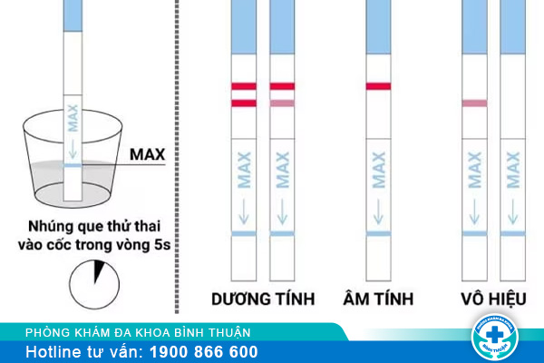Bước 5: Chờ trong 5 phút thì đọc kết quả. Nếu xuất hiện 2 vạch thì bạn đã có thai. Nếu không có thai thì que sẽ hiển thị 1 vạch.